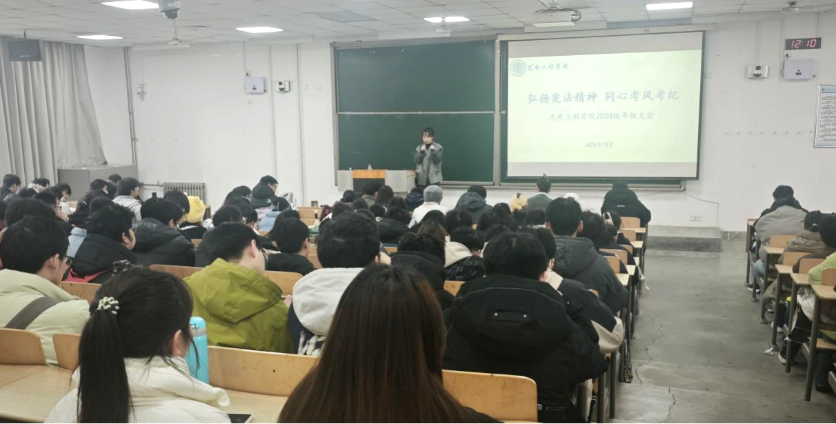 会上,蒋紫洮以“学宪法、守宪法、用宪法”为主题开展宣讲,向学生阐释宪法的重要意义与实践价值,引导学生树立宪法意识。随后,蒋紫洮详细解读了光电信息类省级以上重点学科竞赛项目,结合学院往届参赛获奖案例,鼓励学生组建跨班级、跨专业备赛团队,主动对接专业导师获取指导,充分利用学院实验实训资源,以竞赛为契机锤炼专业技能、培养创新思维。同时,对期末阶段的校园生活规划给予了建议,引导学生梳理各学科知识点,强调了保持规律作息和体育锻炼的重要性。最后,蒋紫洮带领全体学生学习了《西安工业大学学生考试违纪作弊处理办法》,树立“诚信考试光荣,违纪作弊可耻”的观念,鼓励学生相互监督、共同营造公平公正的考试环境。