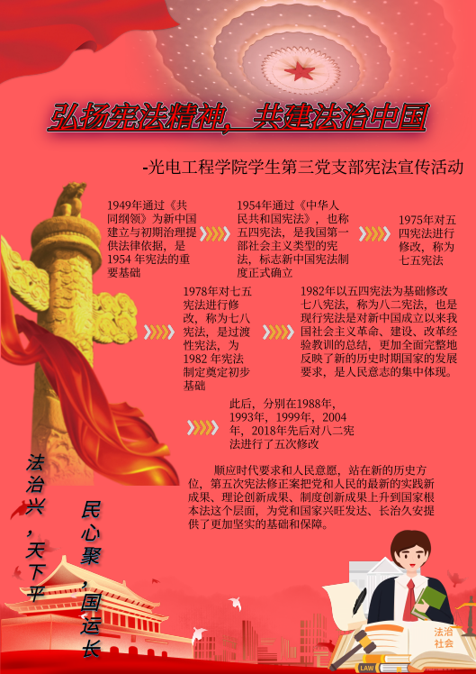 活动中,学生第三党支部党员骨干组成“普法宣讲队”,深入学院办公室、实验室、学生宿舍等场所,结合光电工程专业学习与校园生活实际,通过案例解读、资料发放、互动答疑等形式,向师生们系统阐释了宪法的根本地位、核心要义以及与大学生息息相关的基本权利、义务等重要条款,重点解读了科研诚信、知识产权保护等与学科发展紧密相关的法治知识点。党员代表王新宇分享感悟时表示:“以前总觉得宪法离我们很远,通过这次宣讲我深刻认识到,宪法不仅是治国安邦的总章程,更贯穿于我们学习生活的方方面面。”